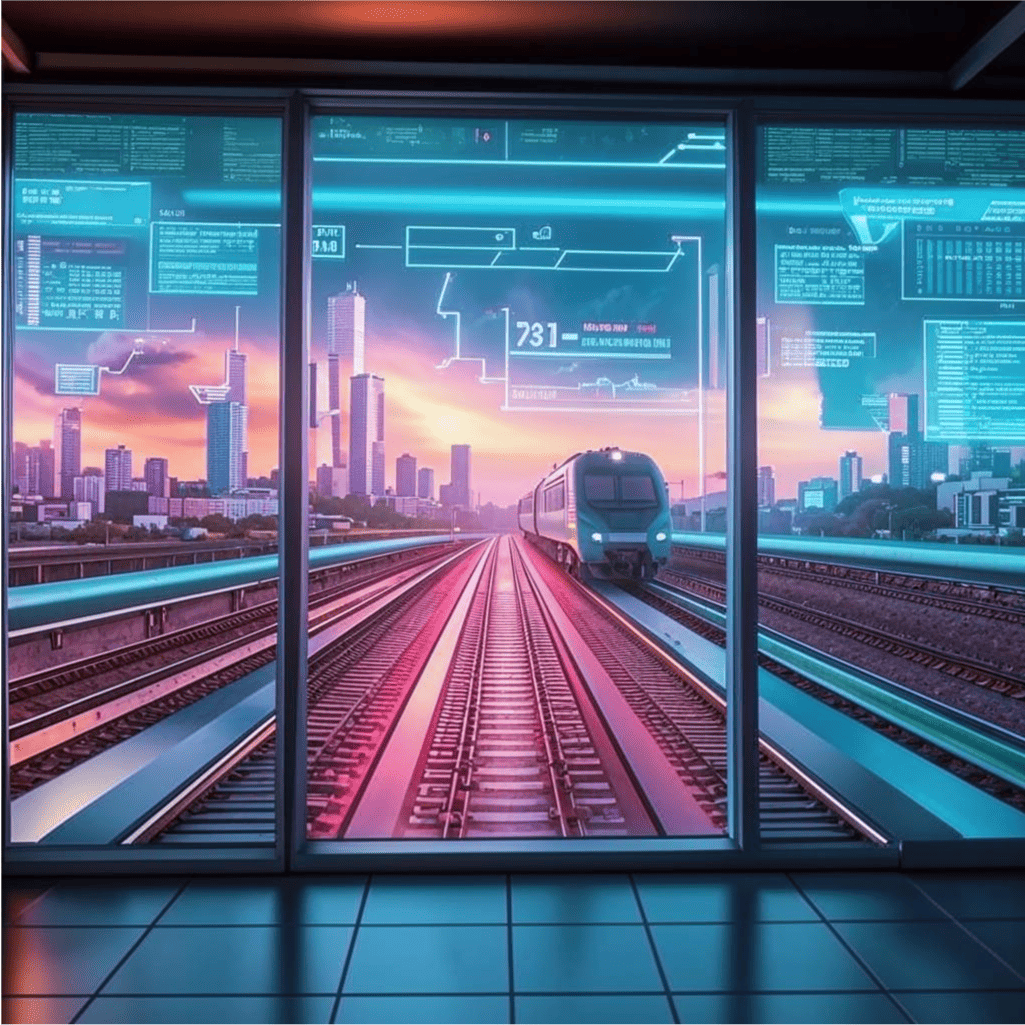 2075 год. Люди выбирают экологичные виды транспорта - поезда. Цифровые табло показывают информацию в режиме реального времени. Работа выполнялась на сайте fusionbrain.ai в стиле: Студийное фото.