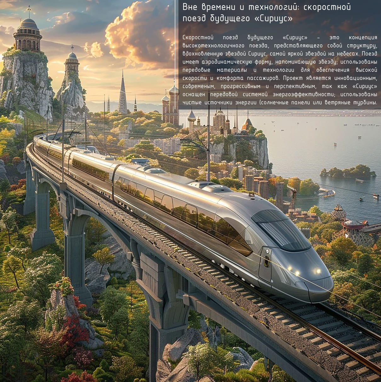 Визуализация разработана с помощью нейросетей Kandinsky (референс) и Midjourney (постобработка). Основная концепция заключается в создании высокоскоростного и экологичного поезда; тесной связи технологии и окружающей среды.