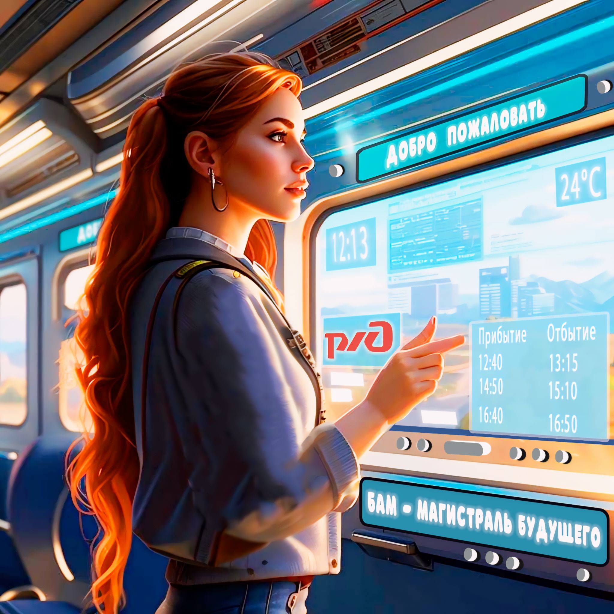 Информационные экраны вместо стекол в поезде дальнего следования, девушка нажимает на экран