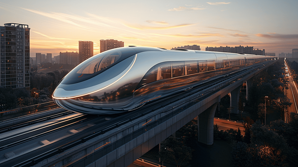 На этой впечатляющей фотографии представлен футуристический высокоскоростной поезд, мчащийся по эстакаде на фоне закатного неба. Гладкие, обтекаемые формы и зеркальная поверхность поезда отражают современный подход к дизайну и технологии. Визуальный образ