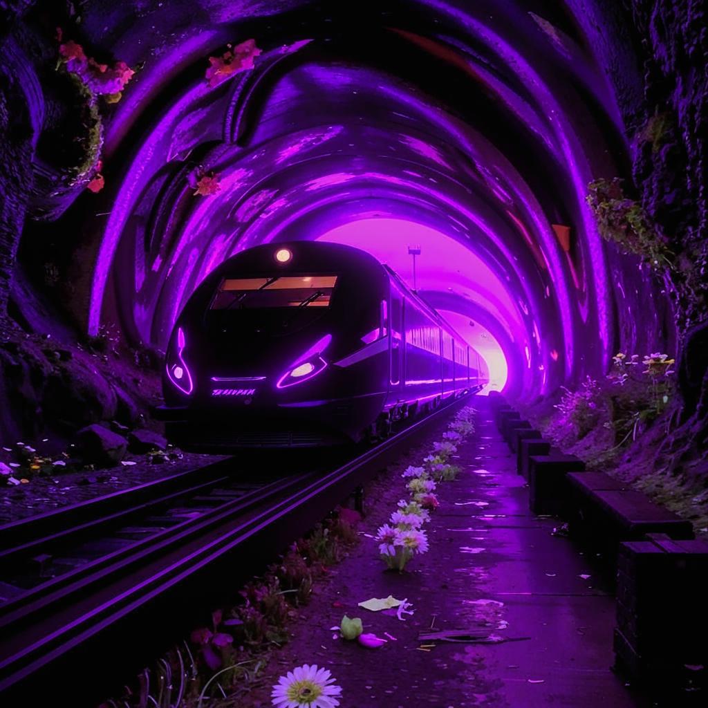 Работа выполнена всё в том же стиле с использованием чёрного цвета и фиолетового неона. Для меня будущее БАМа — это закрытые туннели, где поезда развивают сверхзвуковые скорости для эффективного и безопасного перемещения людей на большие расстояния