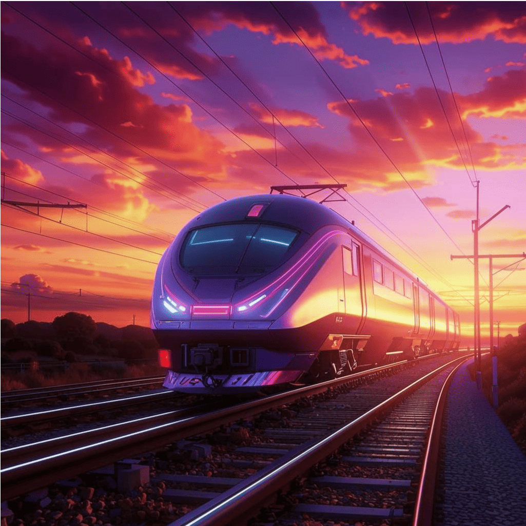 Красивый футуристичный поезд на фоне не менее красивого заката.